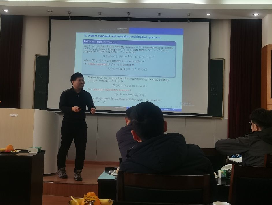 廖灵敏教授的报告题目为 “Multivariate multifractal spectrum of translated Lévy functions” , 主要介绍了 由 Lévy 函数及其平移后的 Lévy 函数的给定 Hölder 指数所对应的水平集 结构。 通过运用丢番图逼近中的方法与结果,廖教授确定了其多变量多重分形谱,即将每一对指数水平映射为相应水平集的 Hausdorff 维数,展示了 重 分形分析与数论方法的深度融合。