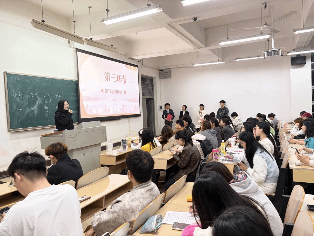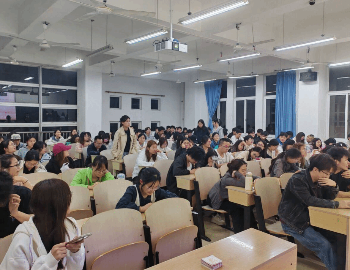 问答环节结束后,同学们结合观影与答题收获,现场撰写心得体会,将对党史的感悟、对青年担当的思考融入字里行间。随后,党服站长崔翎丽上台发言,她首先对同学们的热情参与表示由衷感谢,坦言“原本没想到会有这么多同学到场,看到现场座无虚席,深切感受到了大家对党史学习的重视与热情”。她强调,做好党组织宣传与党服工作,是传递党的温暖、凝聚青年力量的重要纽带,希望同学们以此次活动为契机,主动学习党史、讲好红色故事,用心用情做好党服相关工作,让党的声音在青年群体中落地生根,让红色基因代代相传。