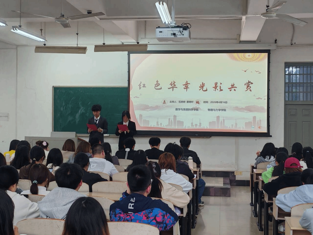 武科大网讯(通讯员袁明珠)为推动党史学习教育走深走实,引导青年学子从百年党史中汲取奋进力量。2026年4月16日晚上18点30分,数学与系统科学学院、物理与力学学院联合开展的“红色华章 光影共赏”主题活动在教学楼21201顺利举行。本次活动由石婷婷、蔡奇轩同学主持,各学生党支部成员踊跃参与,现场座无虚席,氛围热烈。